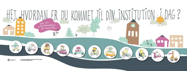 Man laver en 1,5 meter lang plakat (så alle kan nå) og så sætter børnene klistermærker på plakaten alt efter, hvordan de er kommet i børnehave på dagen ... bil, tog, løbehjul, cykel, bus eller til fods.